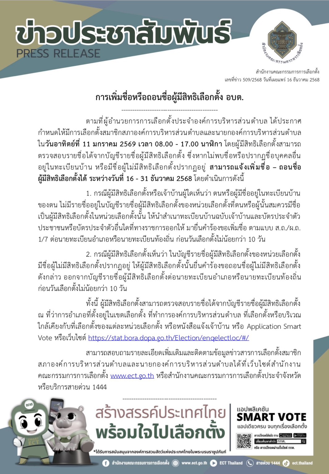 - การเพิ่มชื่อหรือถอนชื่อผู้มีสิทธิเลือกตั้ง อบต. 15/12/2025