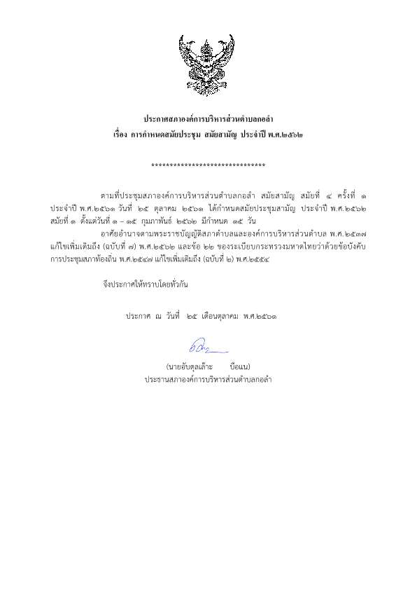ประกาศ อบต.กอลำ เรื่อง การกำหนดสมัยประชุม สมัยสามัญ ประจำปี พ.ศ. 2562
