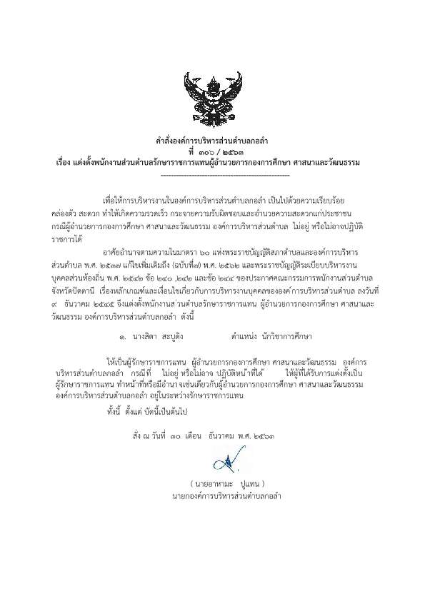 เรื่อง แต่งตั้งพนักงานส่วนตำบลรักษาราชการแทน